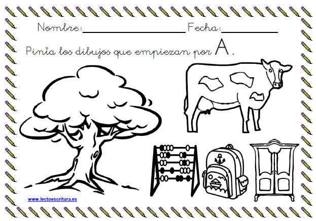 Lectoescritura. Ficha de colorear dibujos que empiezan por la letra a.