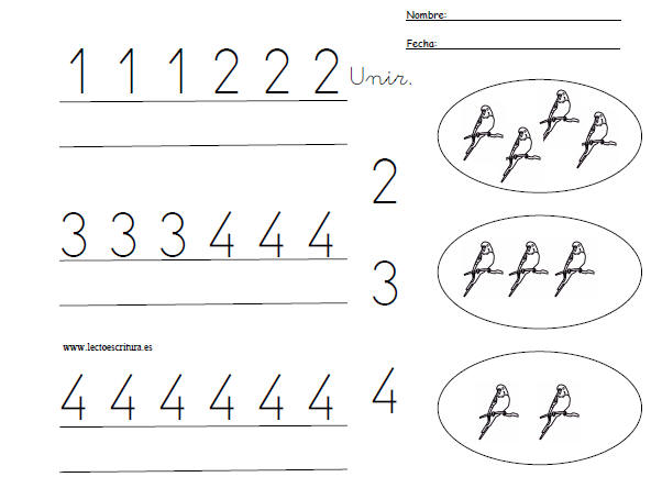 Imprimir ficha del número uno, dos, tres y cuatro. Formato PDF